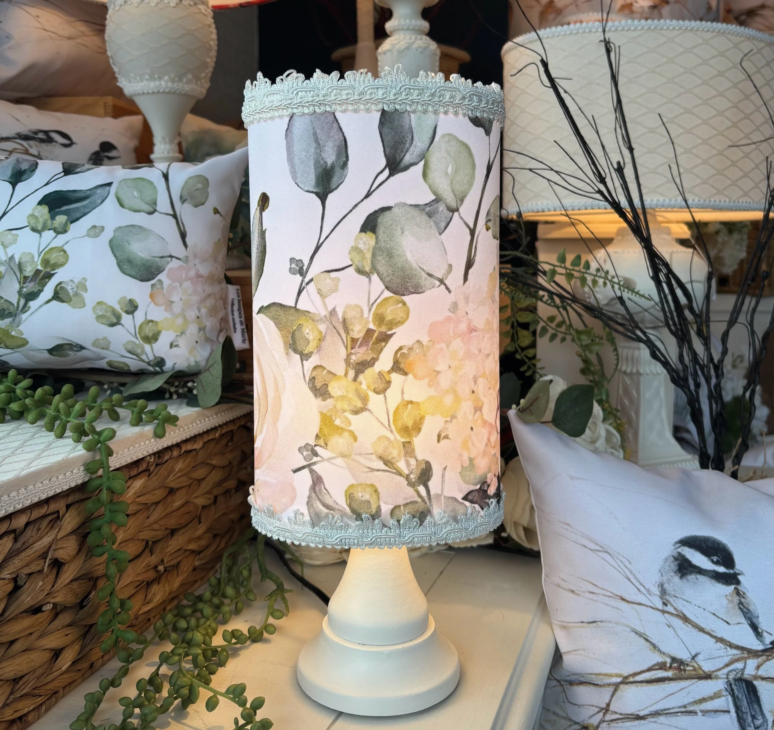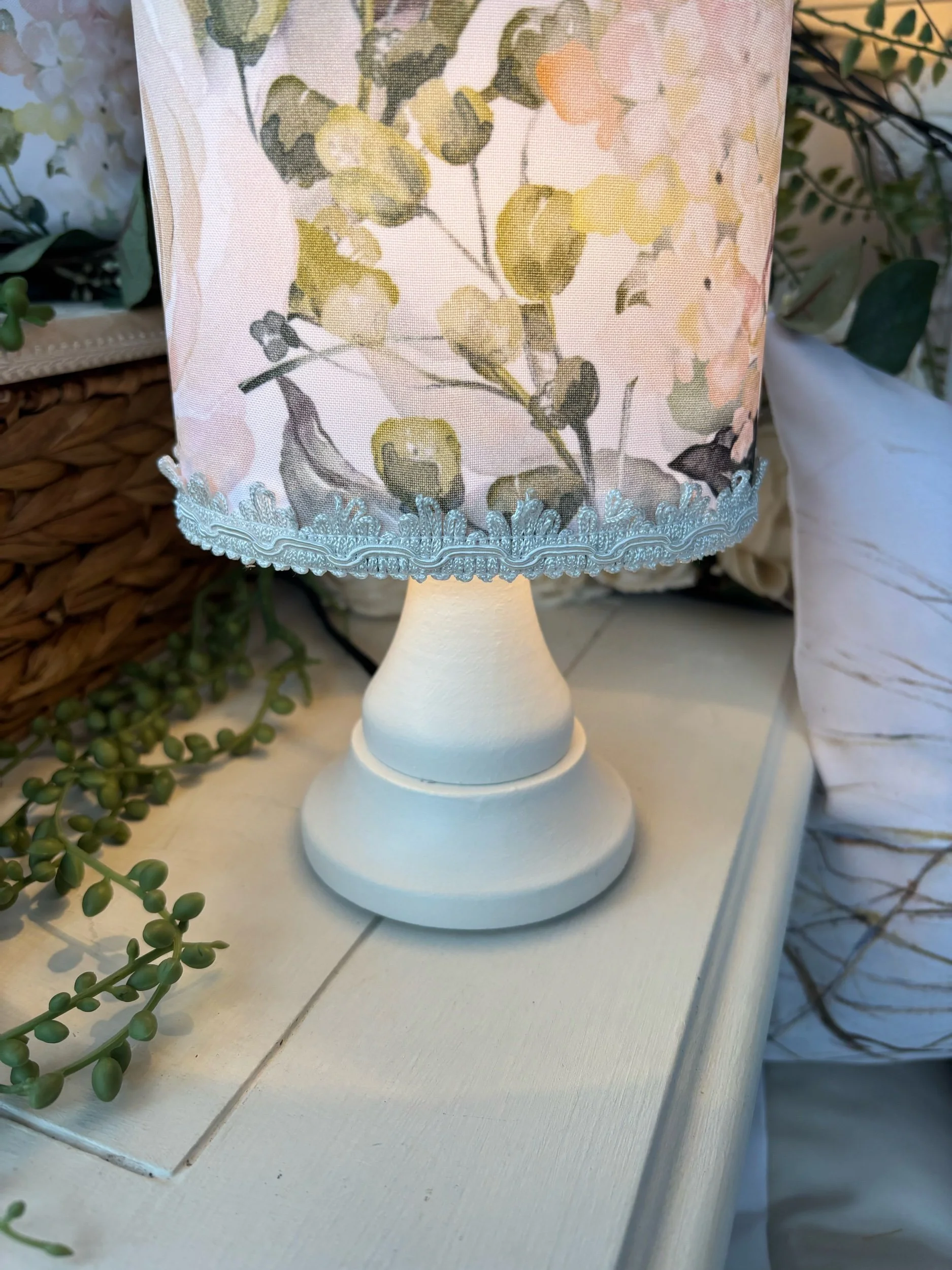 Cette magnifique lampe de table a été créée pour rehausser votre décor. Elle sera un élément artistique et unique. Pour celle-ci, j'ai choisi un tissu de popeline de polyester. La forme ovale et harmonieuse de l’abat-jour donne de l’élégance à cette délicate lampe de chevet. J'y ai ajouté des passementeries pour la raffiner et l’enjoliver. Chaque lampe est faite à la main avec soin dans mon atelier de Saint-Jean-sur-Richelieu. Illustrations d’artistes aquarellistes d’art floral, d’art asiatique et d’art animalier. Quatre artistes ont travaillé sur cette lampe unique, aquarelliste, graphiste, ébéniste et moi, la créatrice de cette lampe. Nous retrouvons sur ce beau tissu de jolies fleurs d’hydrangée et de roses.