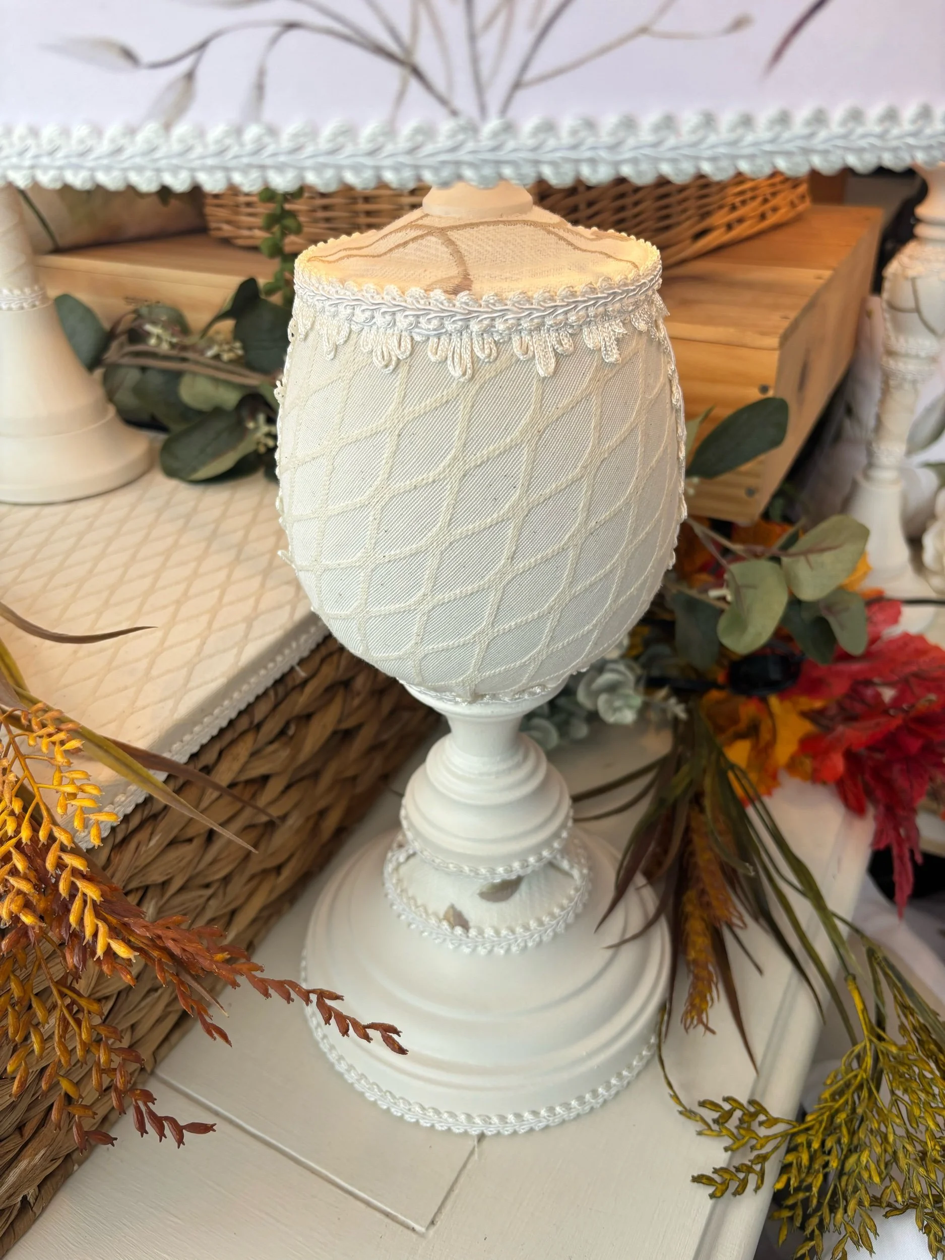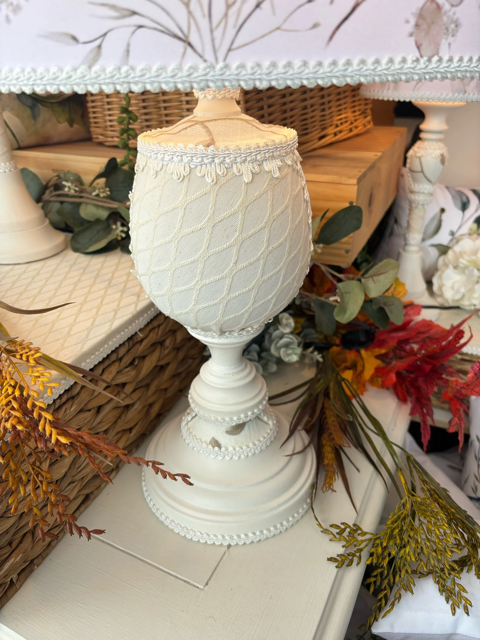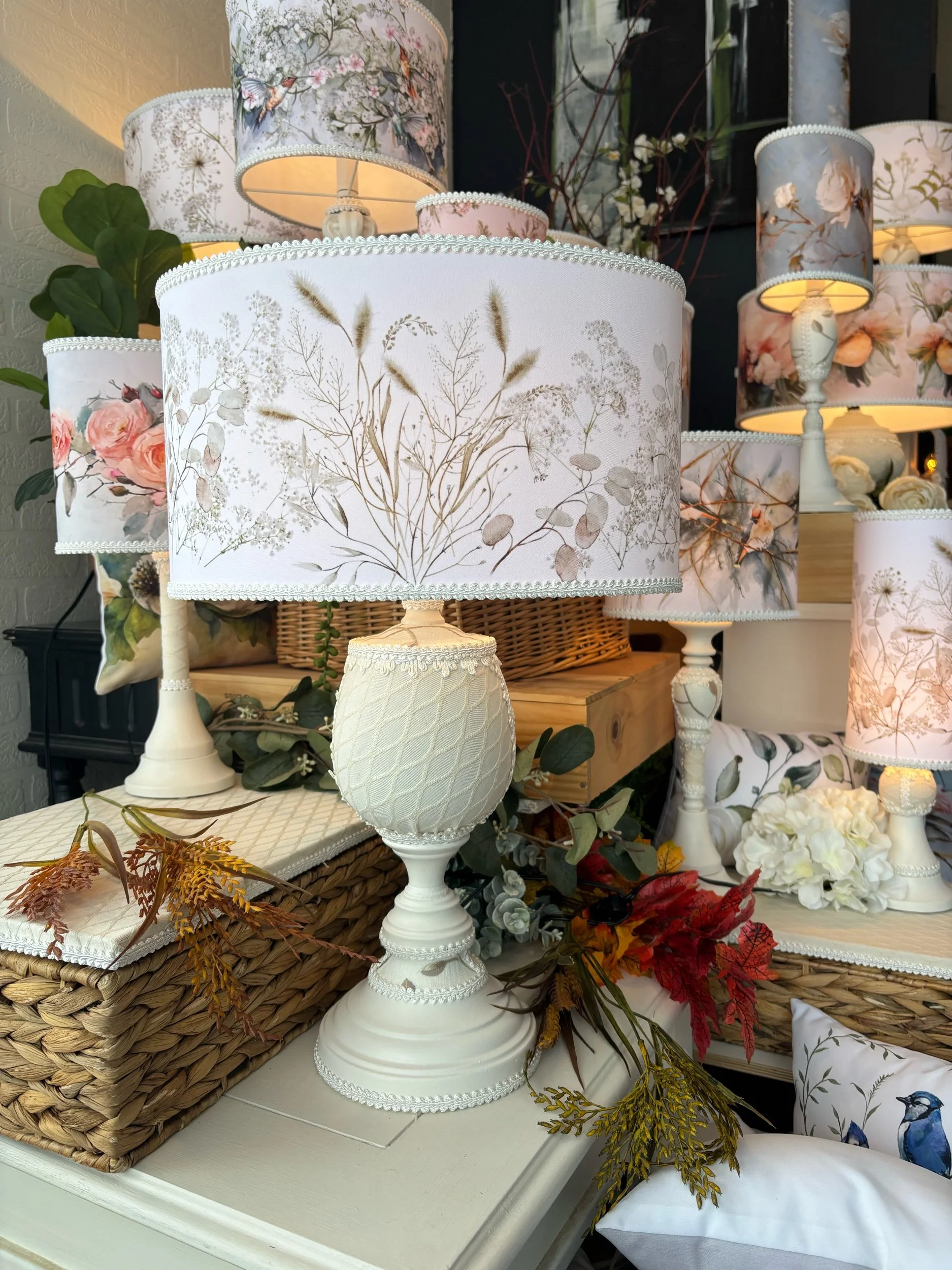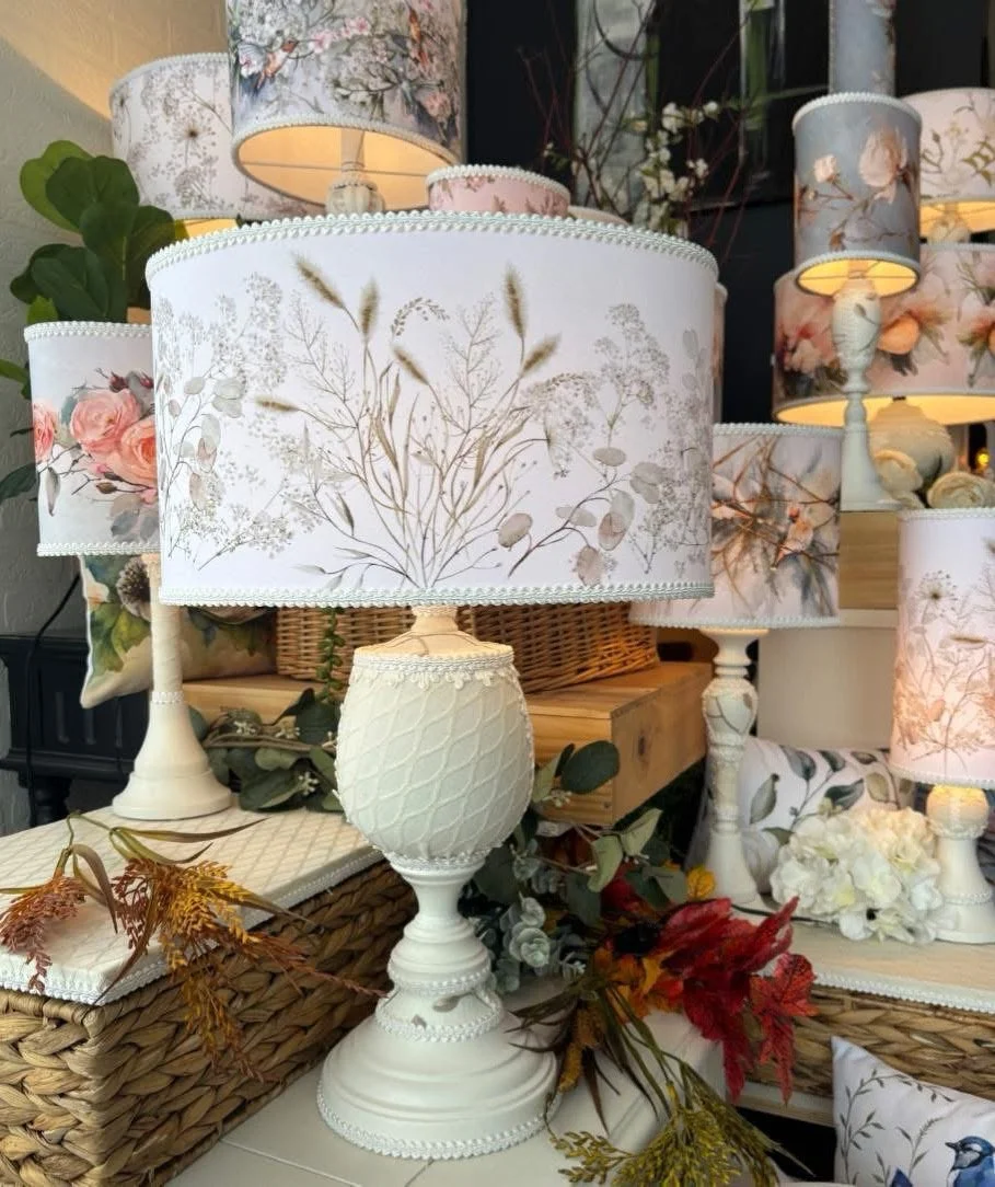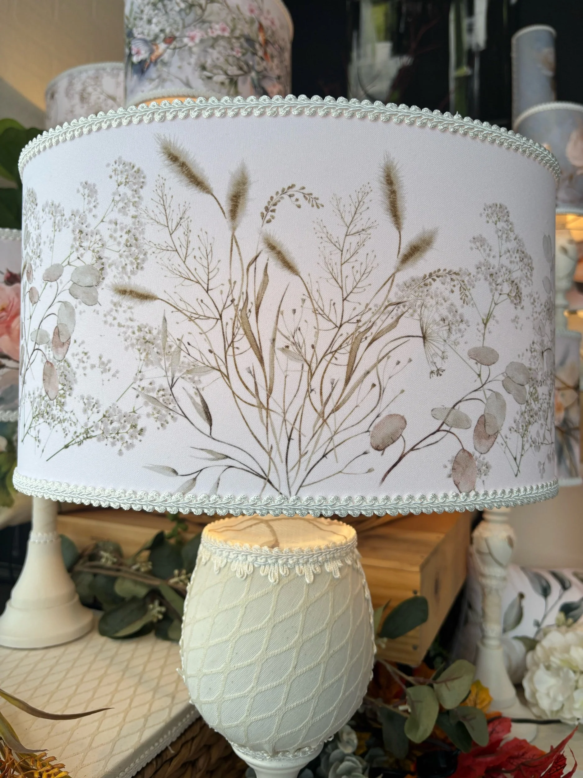 Cette magnifique lampe de table a été créée pour rehausser votre décor. Elle sera un élément artistique et unique. Pour celle-ci, j'ai choisi un tissu de popeline de polyester. La forme ovale et harmonieuse de l’abat-jour donne de l’élégance à cette délicate lampe de chevet. J'y ai ajouté des passementeries pour la raffiner et l’enjoliver. Chaque lampe est faite à la main avec soin dans mon atelier de Saint-Jean-sur-Richelieu. Illustrations d’artistes aquarellistes d’art floral, d’art asiatique et d’art animalier. Trois artistes ont travaillé sur cette lampe unique, aquarelliste, graphiste et moi, la créatrice de cette lampe. Nous retrouvons sur ce beau tissu des motif floral et botanique au caractère intemporel.