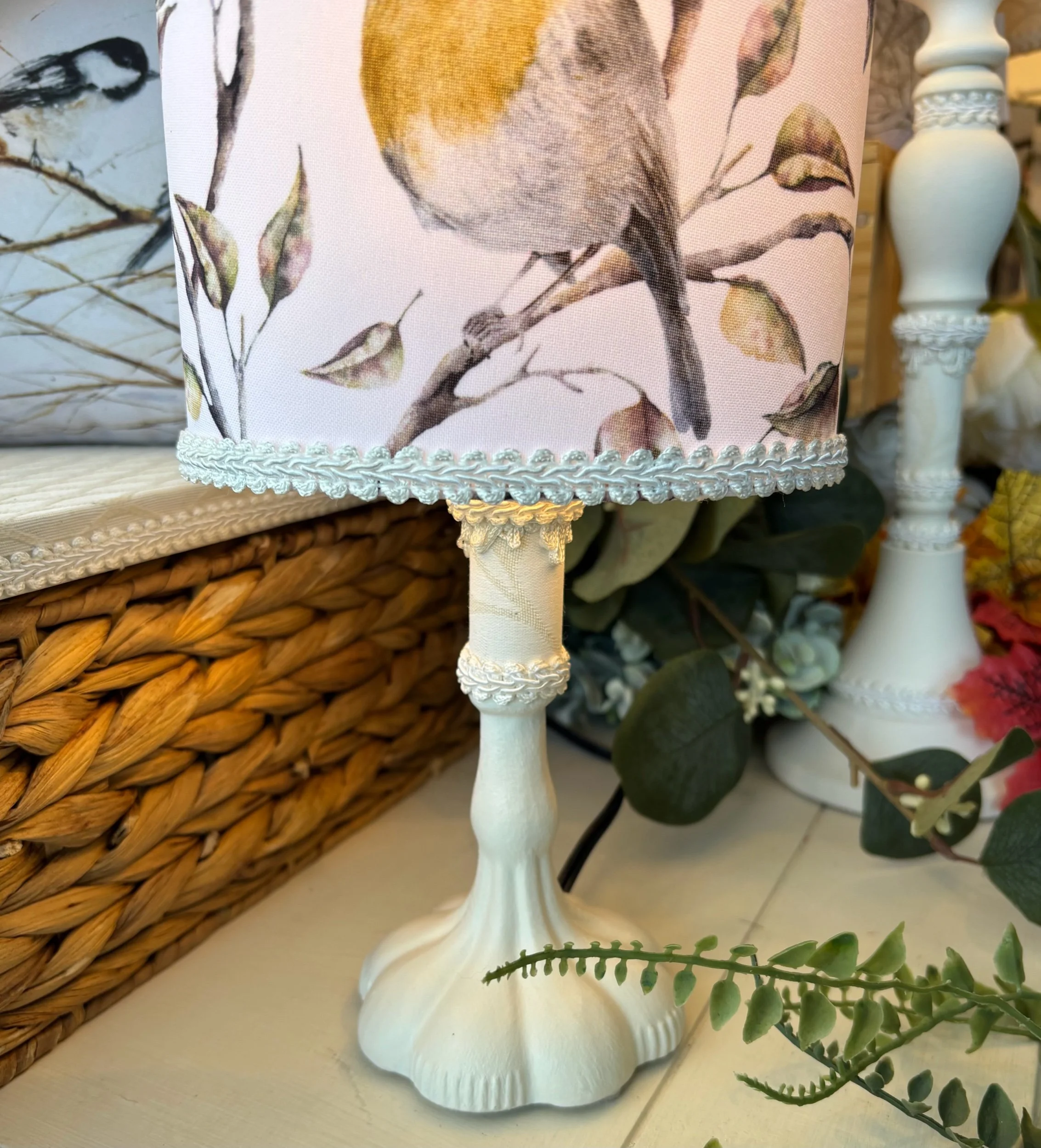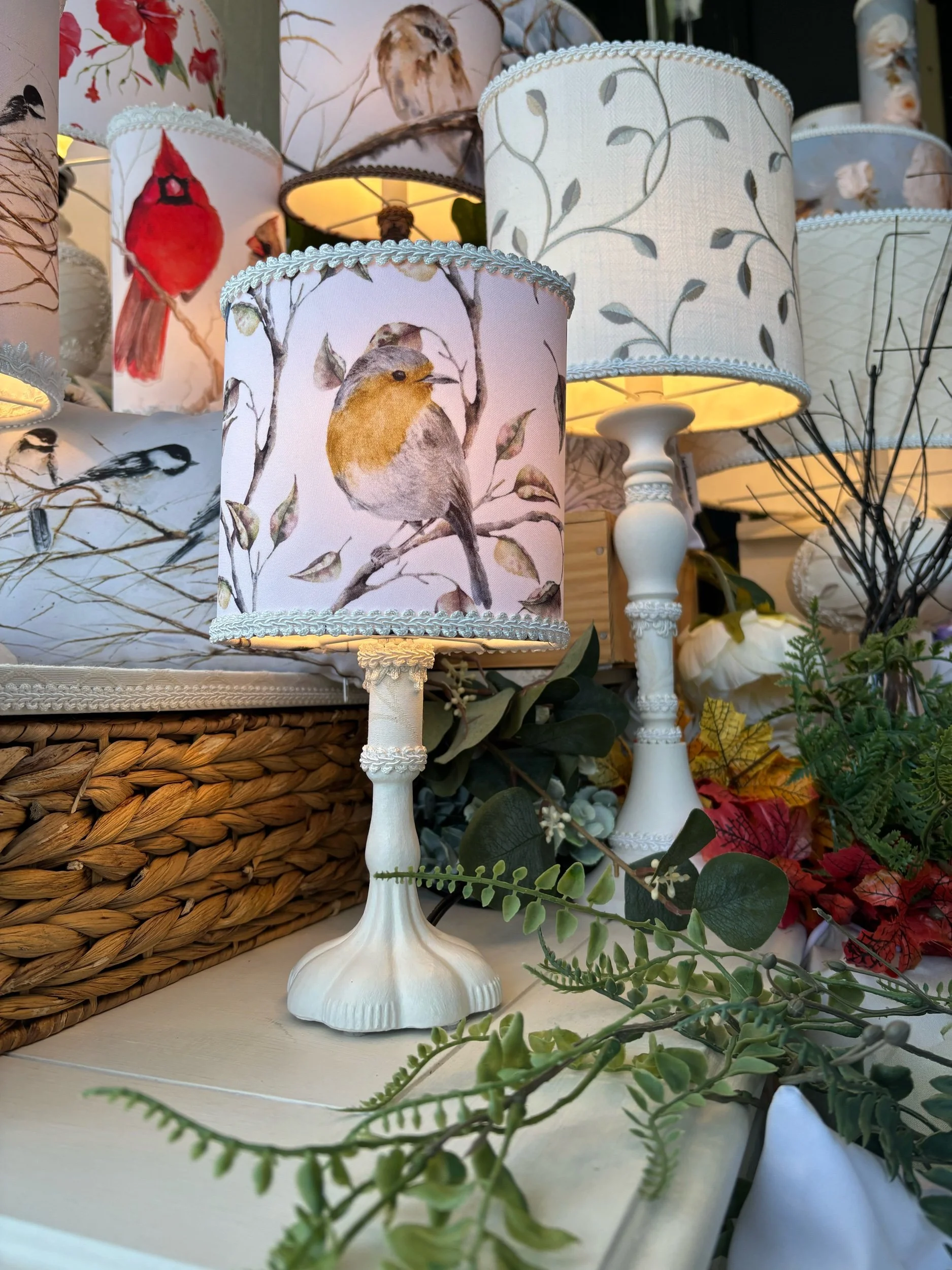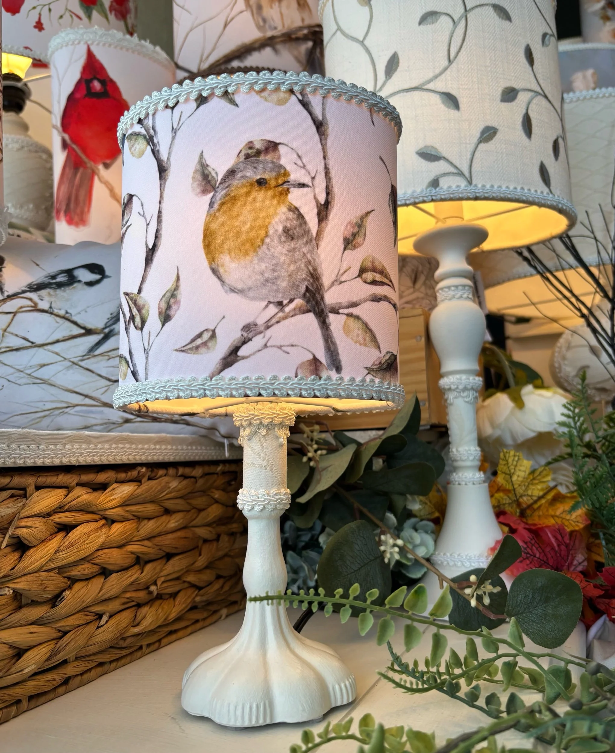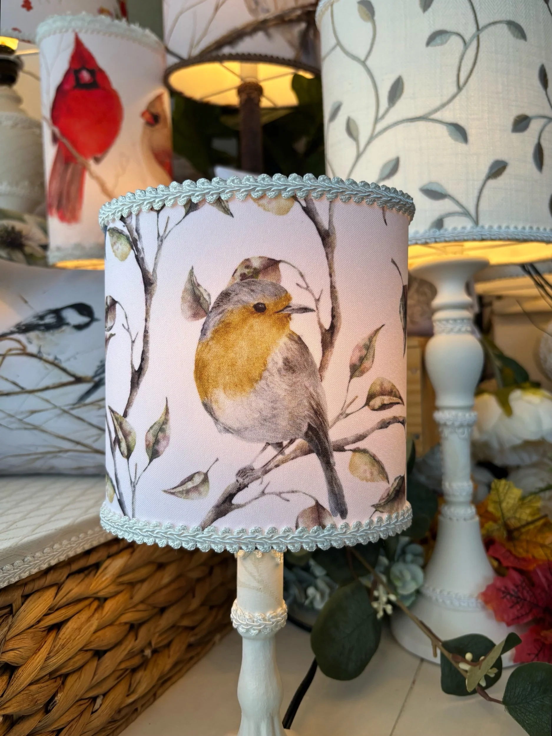 Cette magnifique lampe de table a été créée pour rehausser votre décor. Elle sera un élément artistique et unique. Pour celle-ci, j'ai choisi un tissu de popeline de polyester. La forme ovale et harmonieuse de l’abat-jour donne de l’élégance à cette délicate lampe de chevet. J'y ai ajouté des passementeries pour la raffiner et l’enjoliver. Chaque lampe est faite à la main avec soin dans mon atelier de Saint-Jean-sur-Richelieu. Illustrations d’artistes aquarellistes d’art floral, d’art asiatique et d’art animalier. Trois artistes ont travaillé sur cette lampe unique, aquarelliste, graphiste et moi, la créatrice de cette lampe. Nous retrouvons sur ce beau tissu des rouges-gorges dans leur environnement.